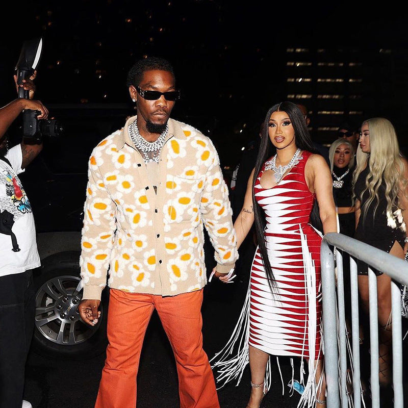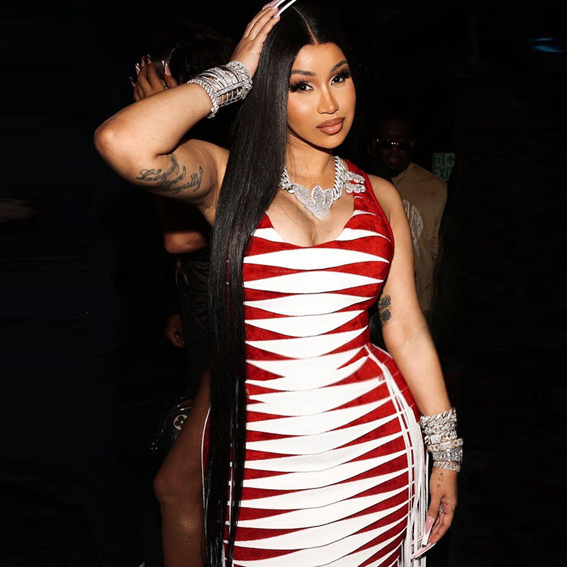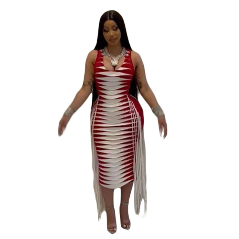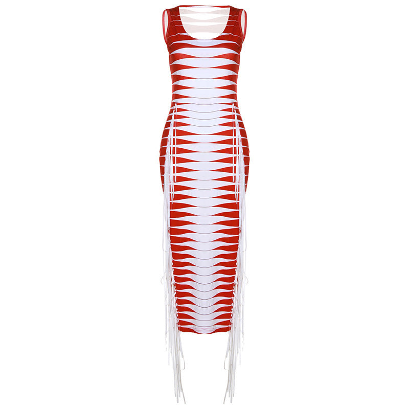 Sleeveless Printed Tassel High Waist Slim Long Dress